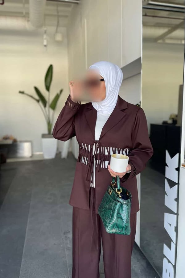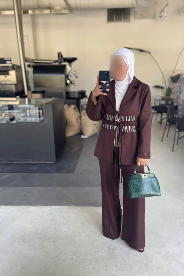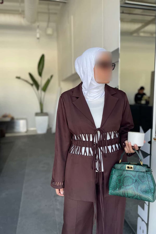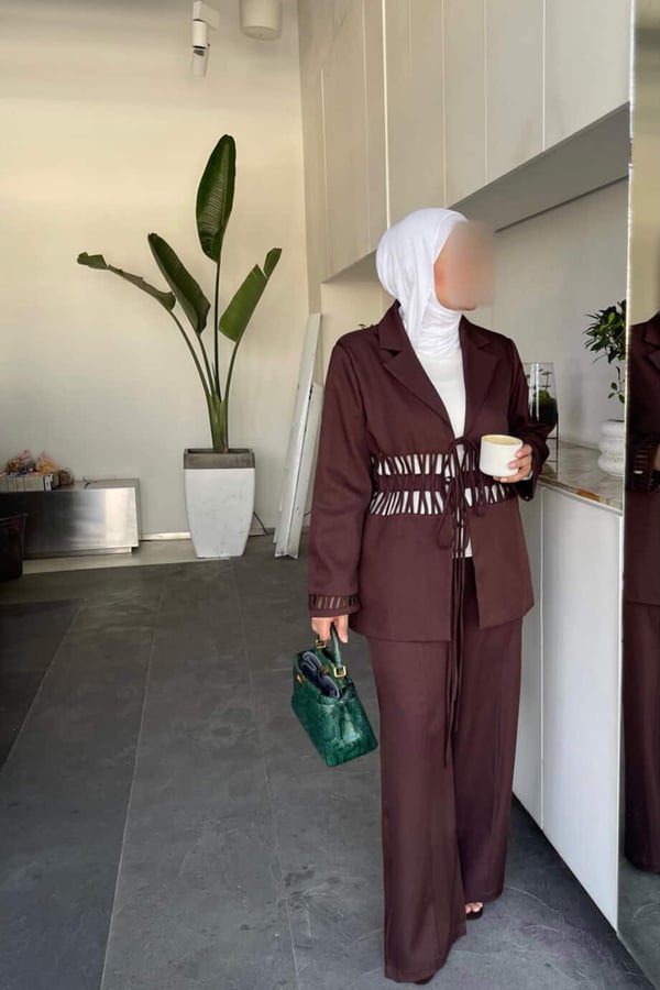 Stylish set of blazer and trouser with open blazer from the west side with same fabric belt