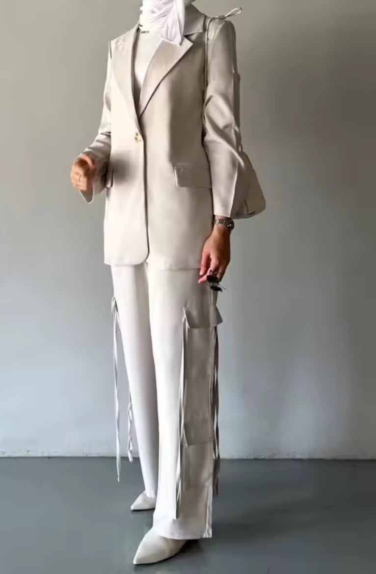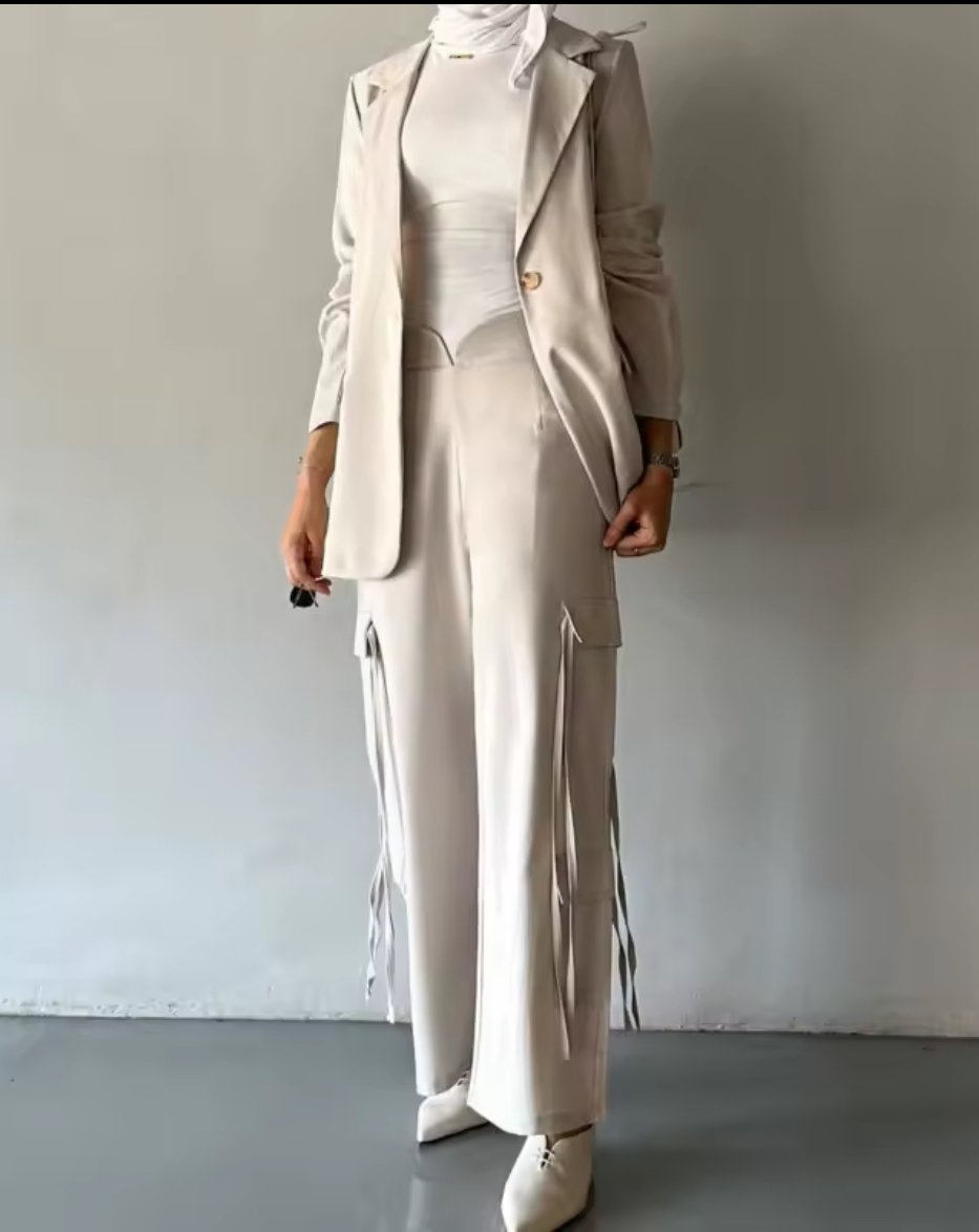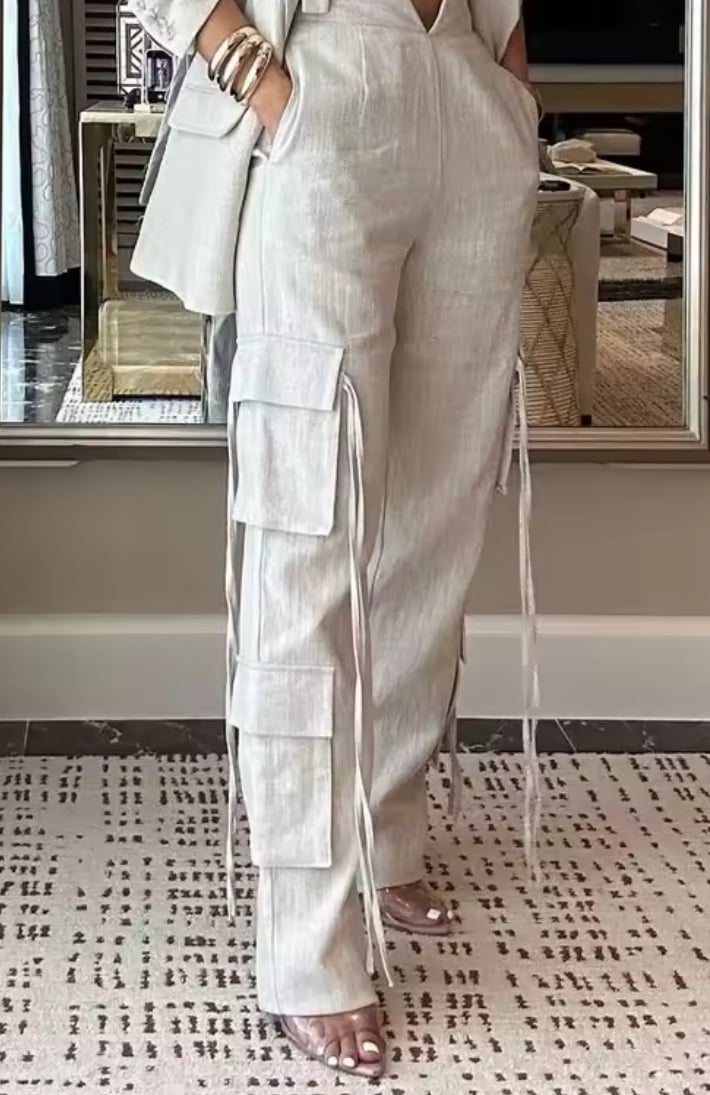Elegant linen off white set blazer and wide leg cargo pants