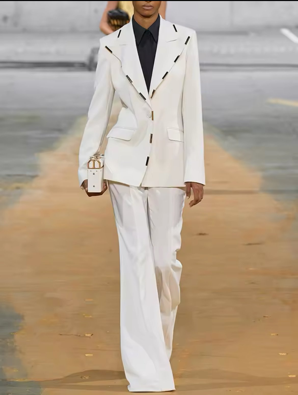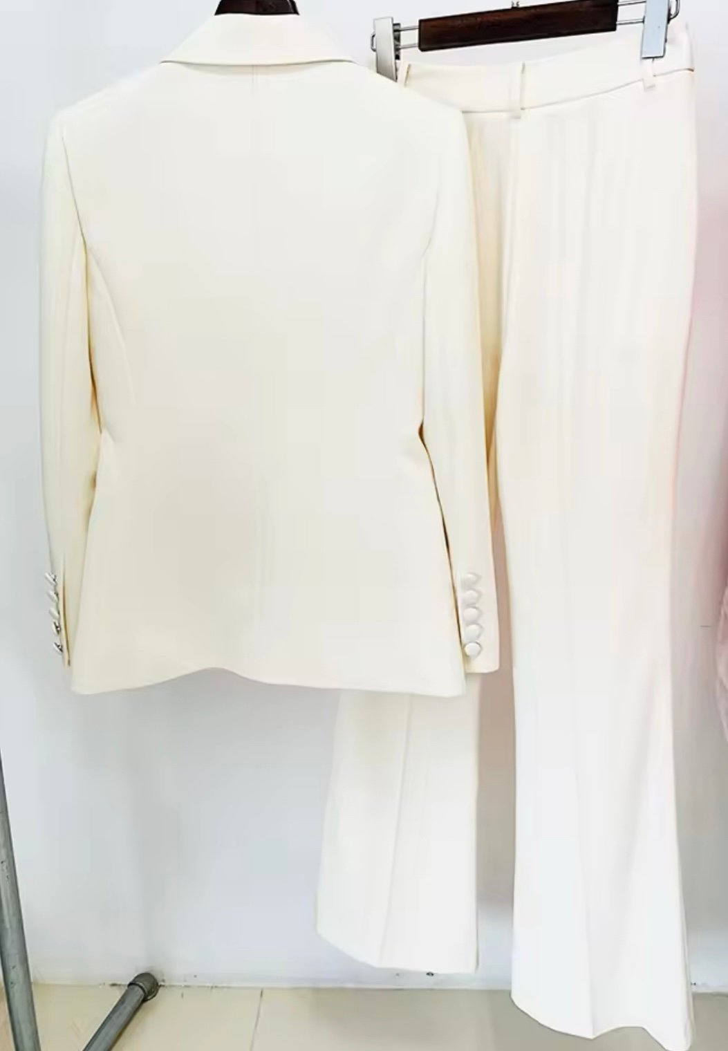 Set of blazer and trouser with metallic accessories on the collar