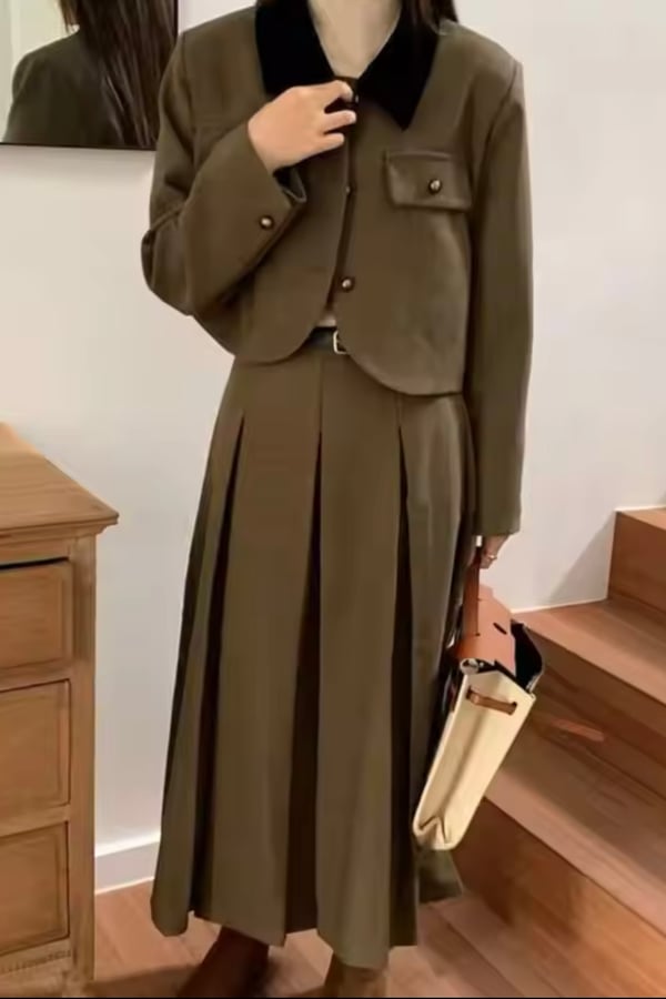 Elegant set of two pieces pleated skirt with cropped jacket with black collar